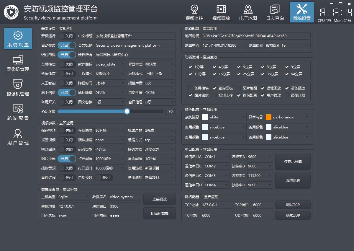 | frmconfigsystem | 系统设置,包括基本设置、视频参数、数据库设置、地图配置、功能激活、颜色配置、串口配置、网络配置等。 |