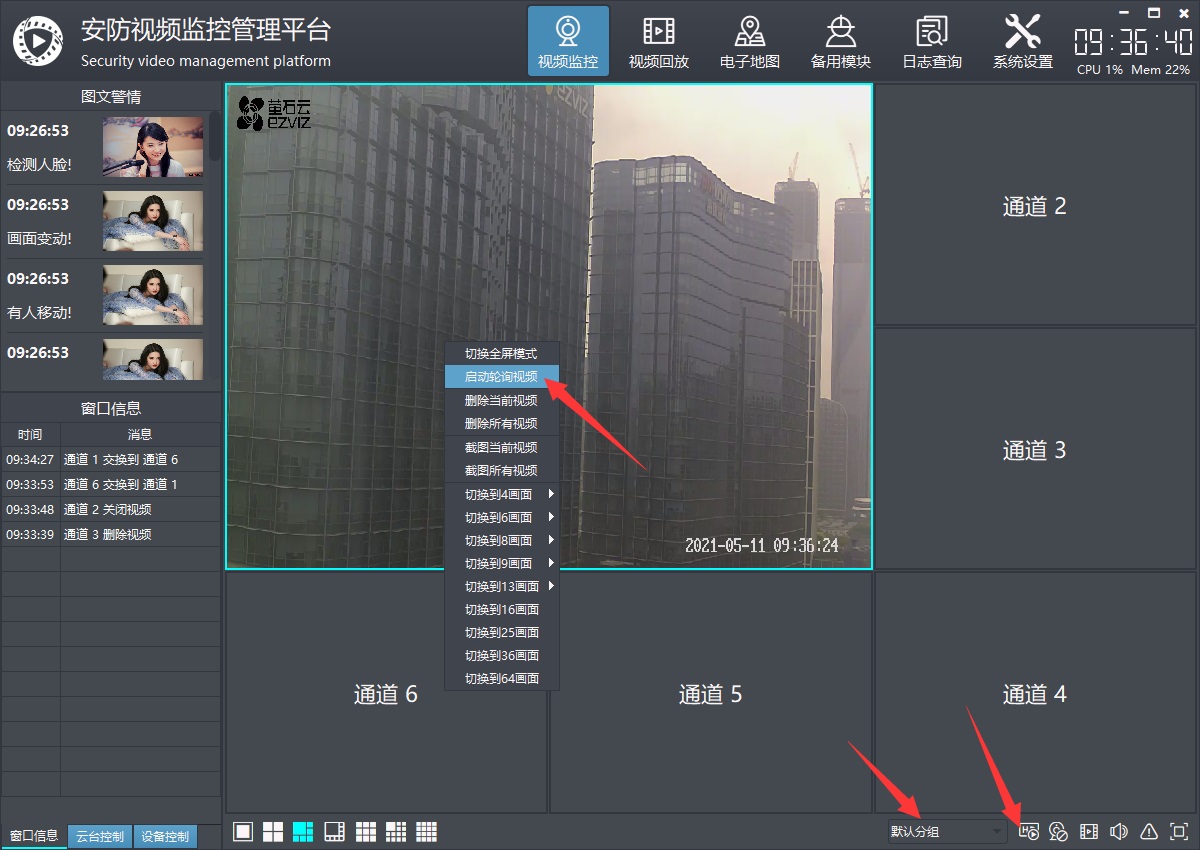 视频轮询默认4画面轮询,如果需要其他画面,可以在系统设置中设置即可。 有两种方式可以启动视频轮询功能: