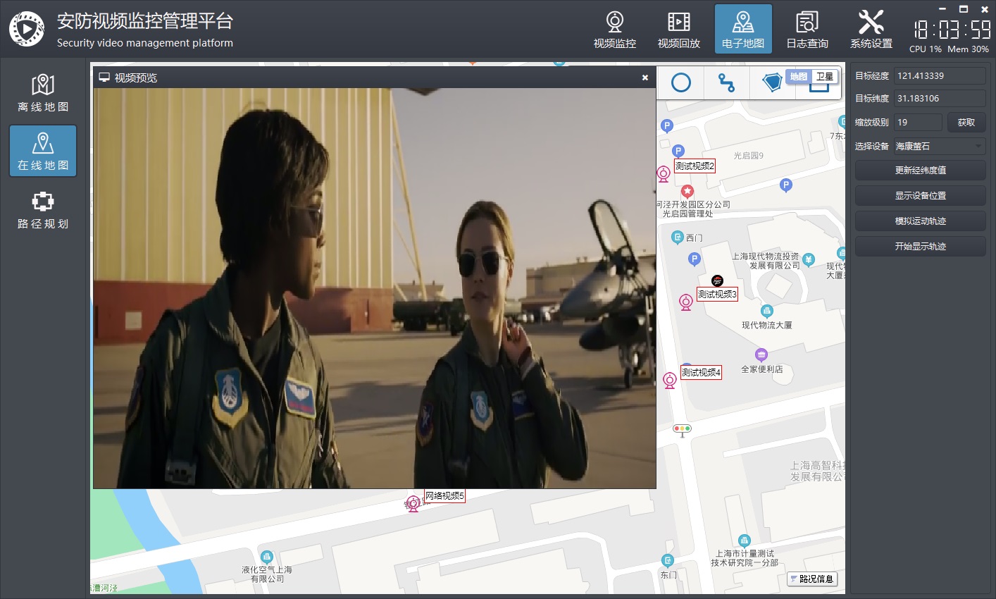 11. 双击设备弹出实时预览视频,支持图片地图、在线地图、离线地图等。