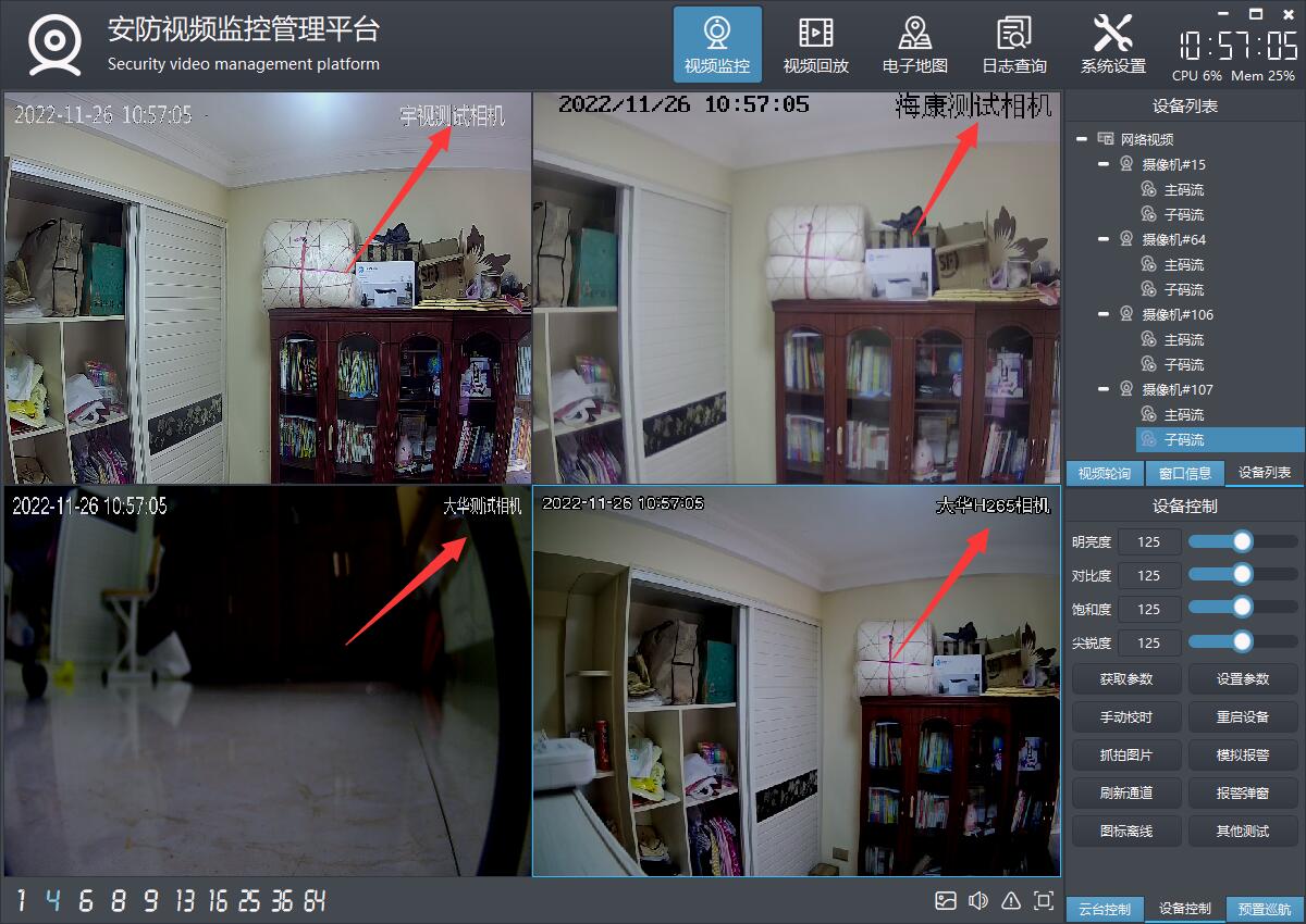 双击摄像机节点自动播放视频,双击节点自动依次添加视频,会自动跳到下一个,双击父节点自动添加该节点下的所有视频。可选主码流、子码流。