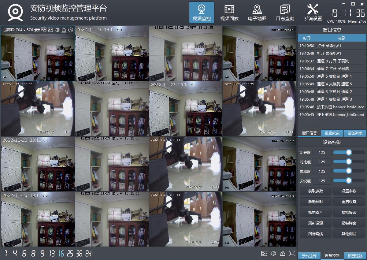主要功能包括摄像机管理,实时视频显示,视频轮询、视频存储、设备地图显示,各种画面切换,各种悬停子模块、onvif搜索设备和云台控制及预置位,通用的NVR视频流播放(比如海康的NVR支持直接取流回放),录像计划、用户管理等功能。