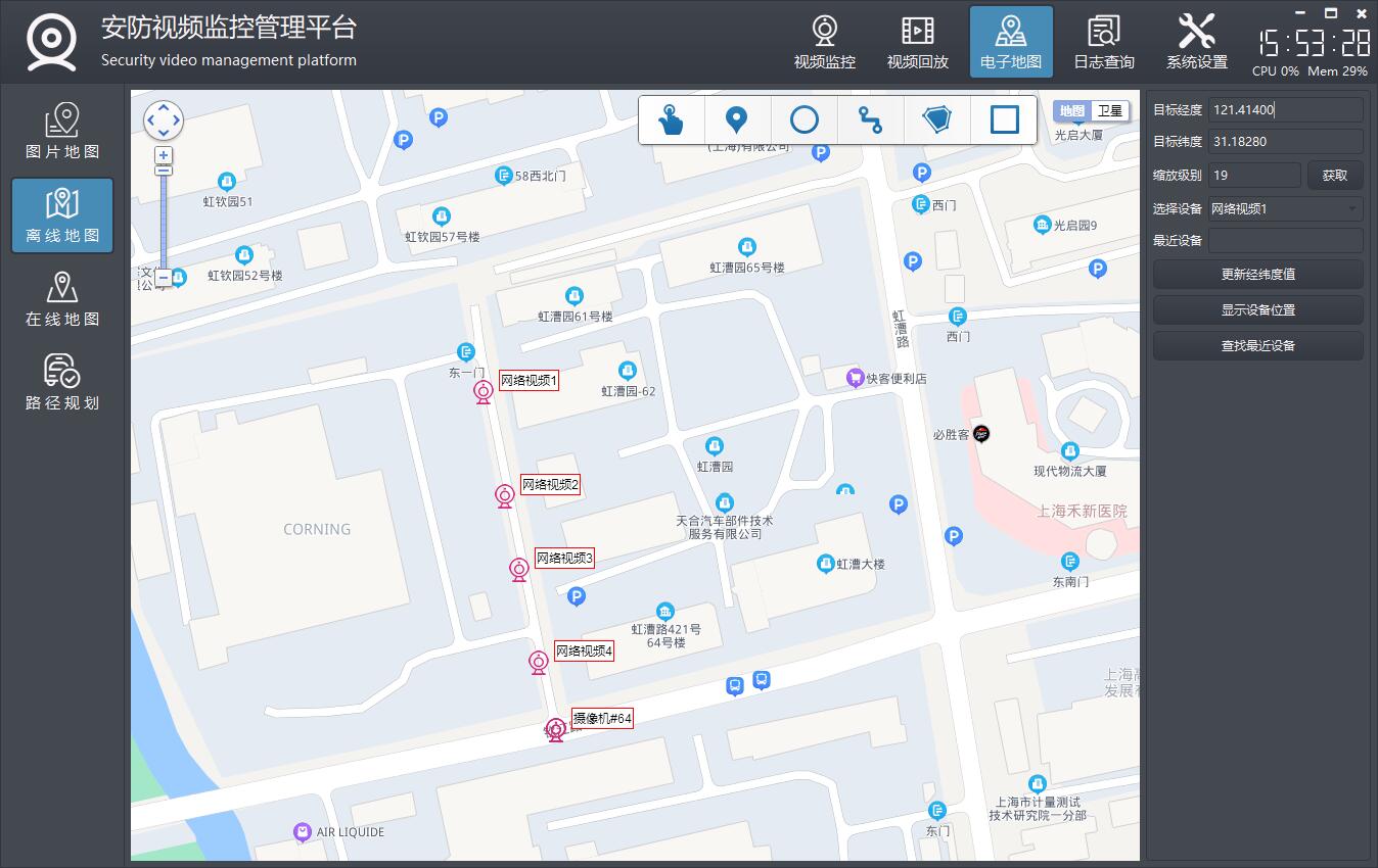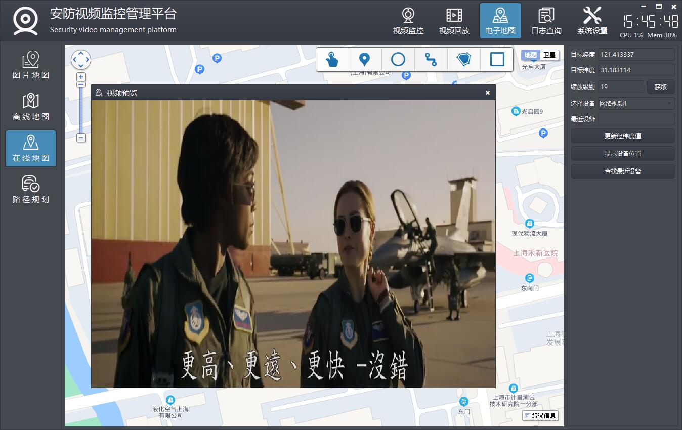 双击设备弹出实时预览视频,支持图片地图、在线地图、离线地图等。