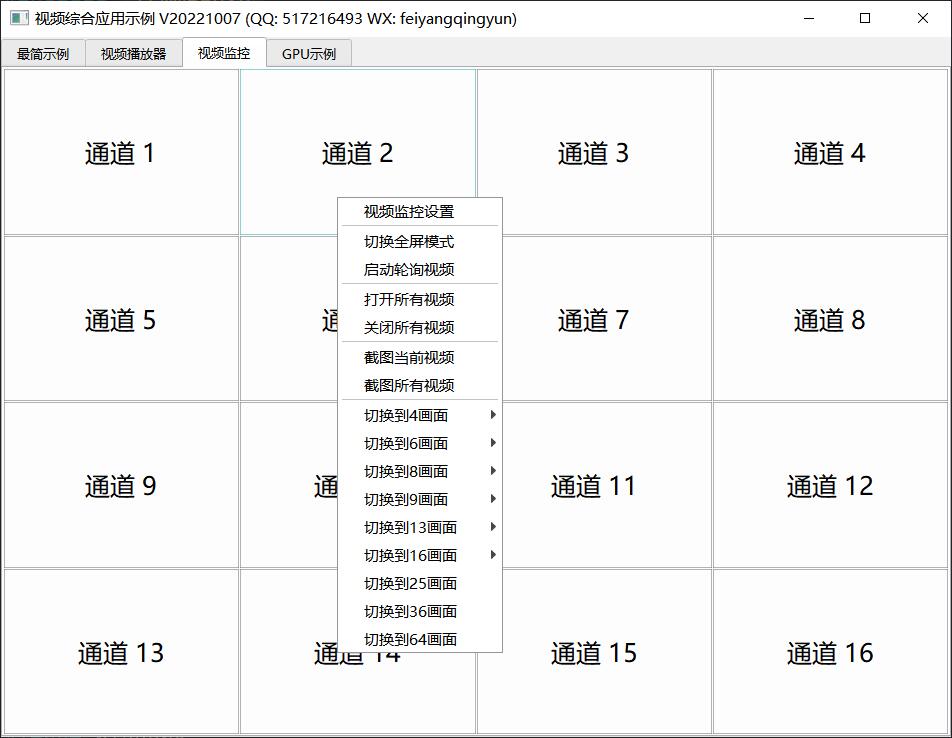 程序实时显示界面最大可以到64路,每个通道都是打开的时候才会去建立连接取视频流,而不是一开始就建立了连接。