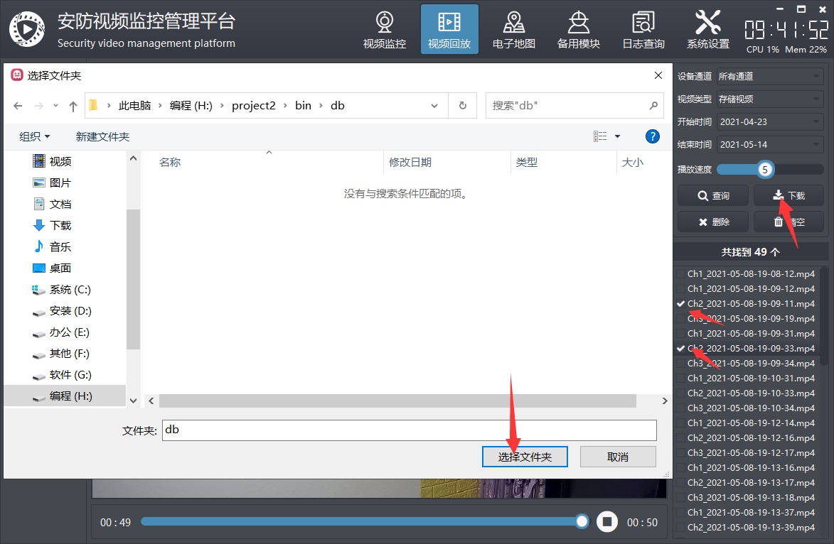 视频下载是将查询出来的视频文件,按照勾选了的文件保存到选择的目录中。