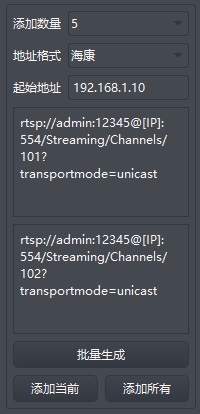 轮询表信息可以通过已添加的摄像机信息表选中添加,也可以自定义规则批量生成视频流地址添加,这种应用场景非常多,比如现场是某一种品牌的摄像机,视频流格式固定,只需要设置好主码流子码流的视频流格式,便可批量生成。