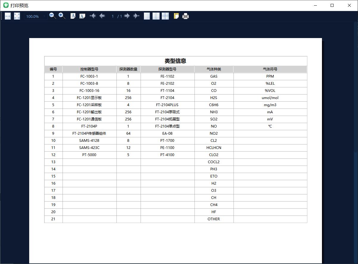 7. 类型管理可配置控制器型号、探测器型号、气体种类、气体符号等。