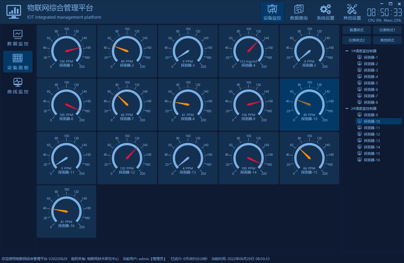 20. 四种监控模式,设备面板监控、地图监控、表格数据监控、曲线数据监控,可自由切换,四种模式下都实时展示采集到的数据,报警闪烁等。
