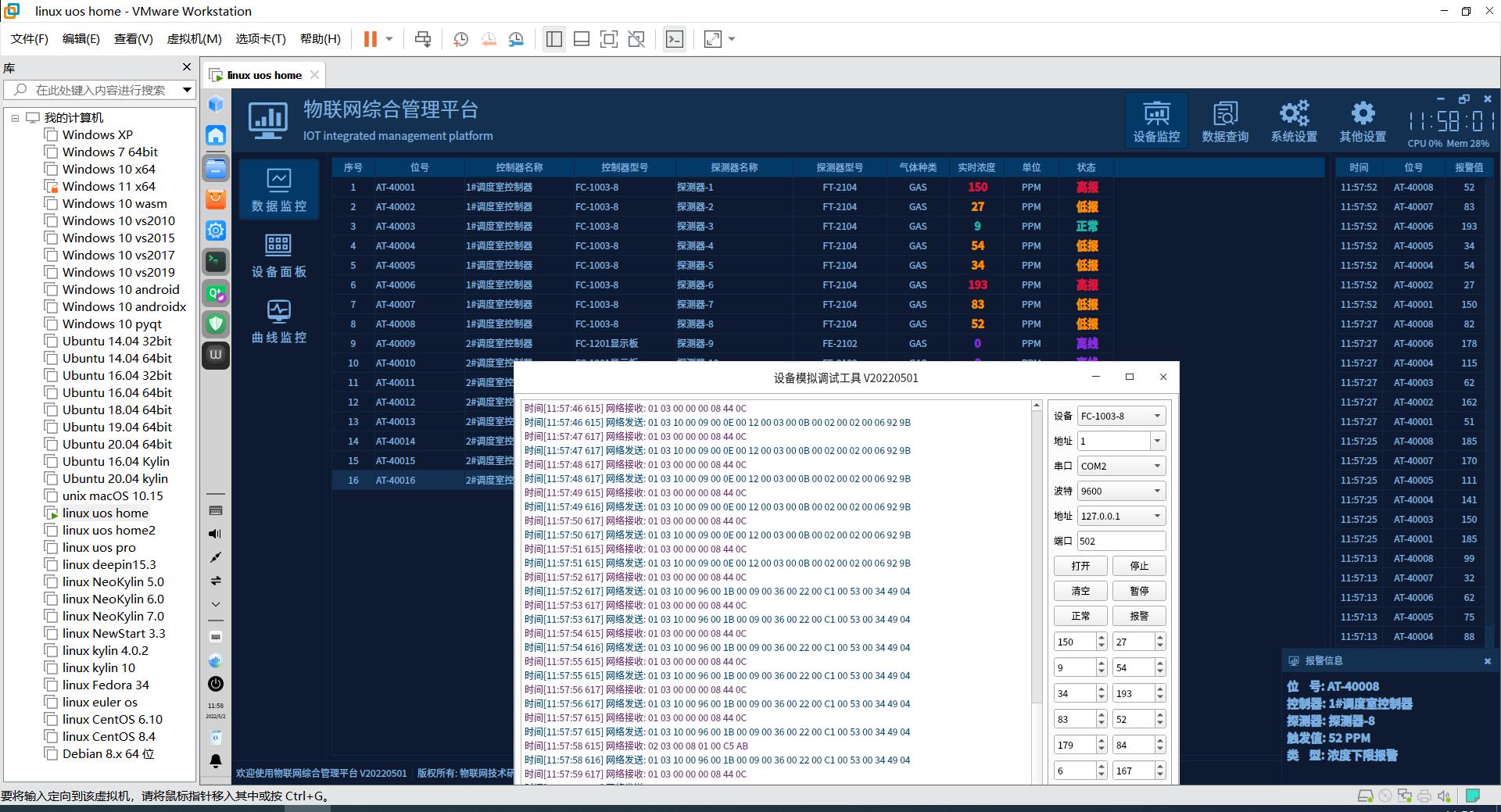 本系统专门配备了设备模拟工具,用来在没有外接真实设备的时候,模拟modbus协议数据,支持多个设备,支持串口和网络方式,可切换正常数据和报警数据,反应到主程序上。对应主程序中两种端口,一种是串口端口(这个可以用虚拟串口工具 Virtual Serial Port 虚拟一对串口用于测试),一种是网络端口(注意选择的监听主机地址和端口)。数据库模拟对应程序中的数据库采集运行模式,可以勾选自动模拟复选框。随机生成状态字段数据。