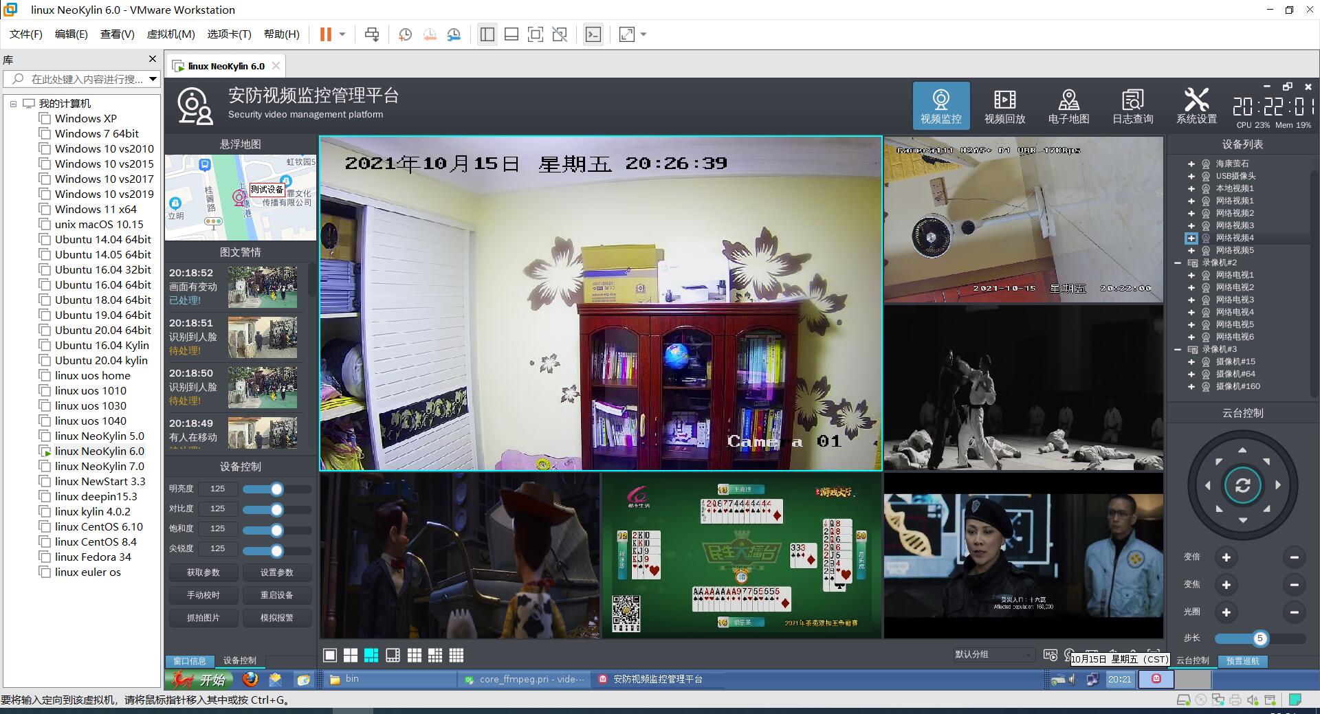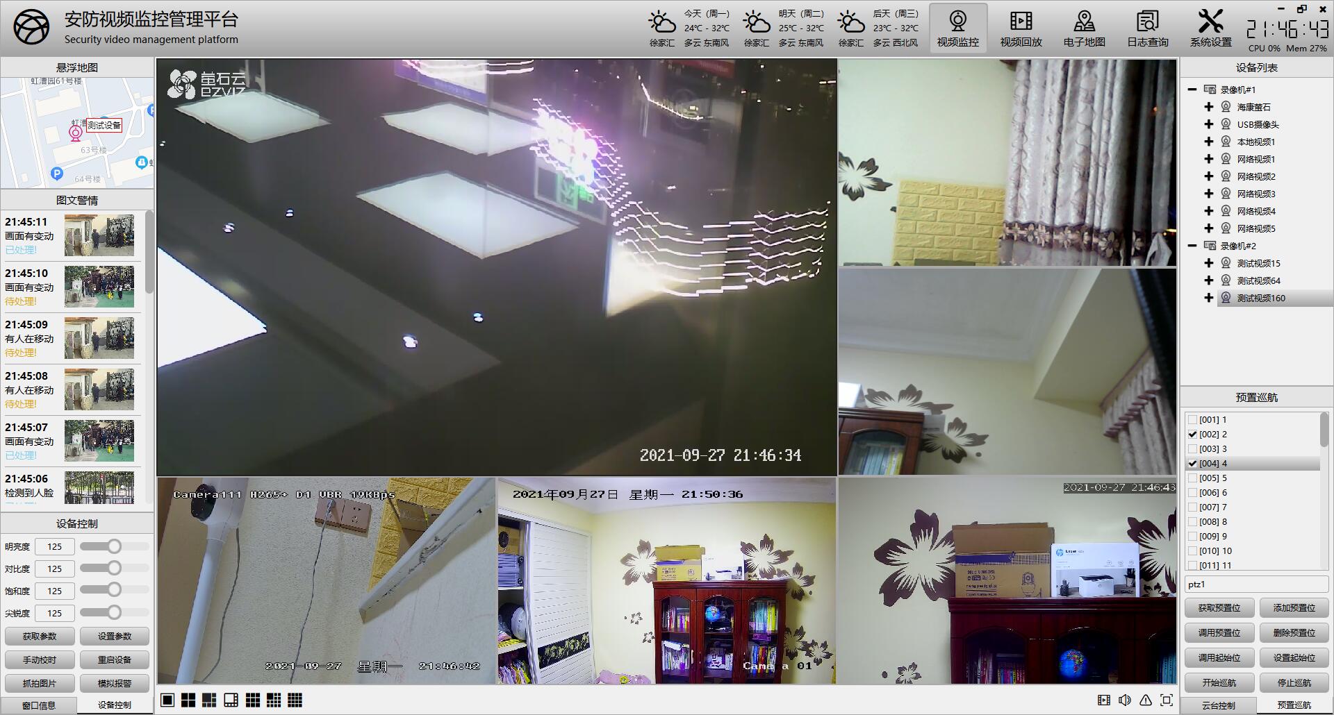 1. 视频监控模块,各种停靠小窗体子模块,包括设备列表、图文警情、窗口信息、云台控制、预置位、巡航设置、设备控制、悬浮地图、网页浏览等。