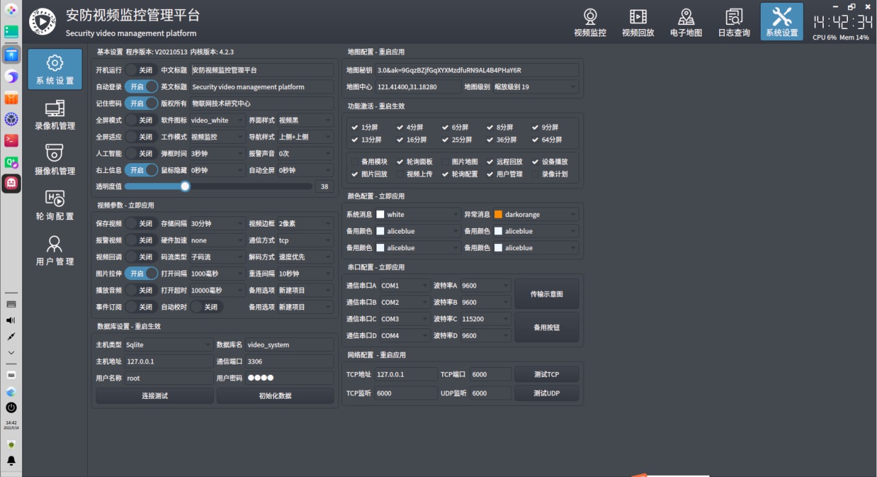 5. 系统设置模块,包括系统设置(基本设置、视频参数、数据库设置、地图配置、串口配置等)、录像机管理、摄像机管理、轮询配置、用户管理等。