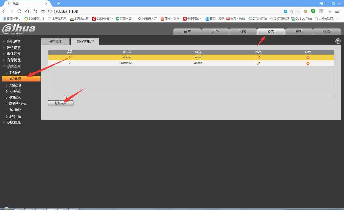大华摄像机,需要在用户管理中添加onvif用户,添加好以后建议重启摄像机应用。