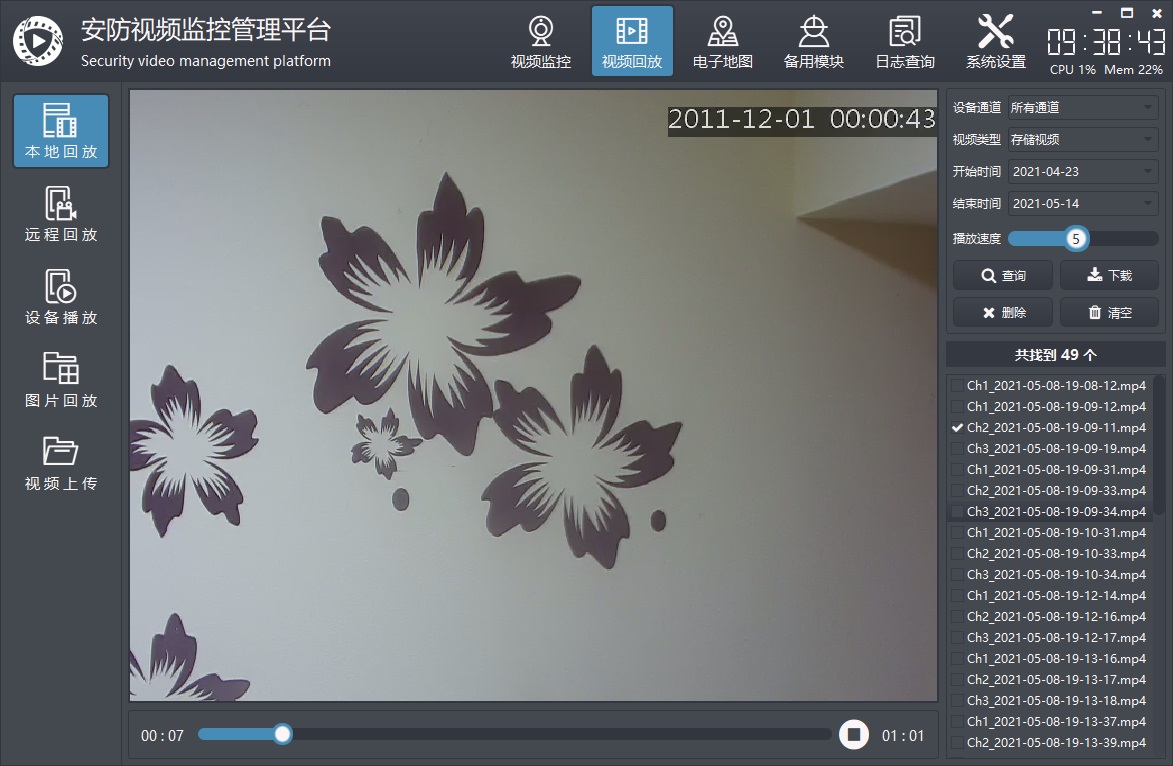2. 视频回放模块,包括本地回放、远程回放、设备播放、图片回放、视频上传等。