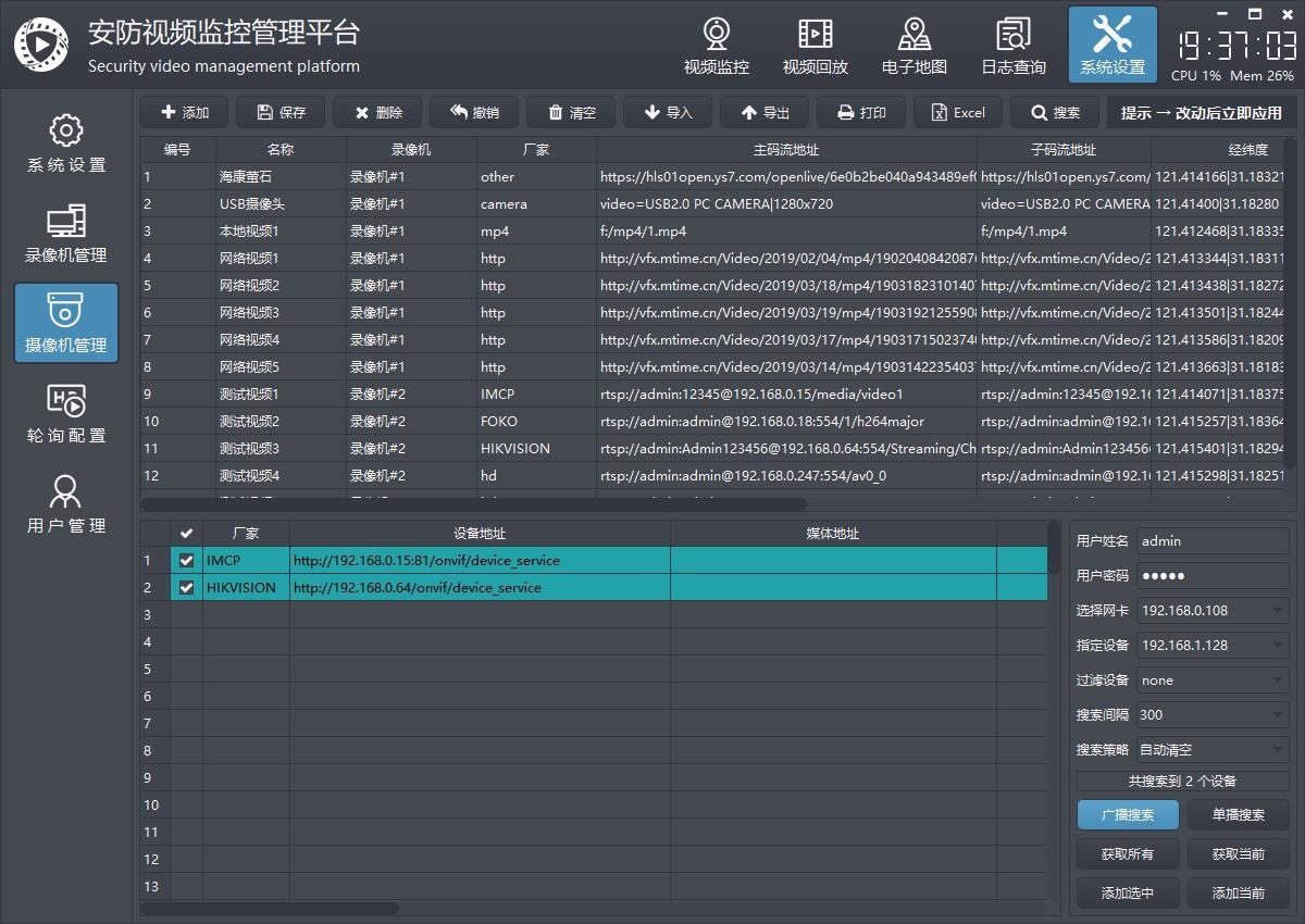 11. 录像机管理、摄像机管理,可添加删除修改导入导出打印信息,立即应用新的设备信息生成树状列表,不需重启。