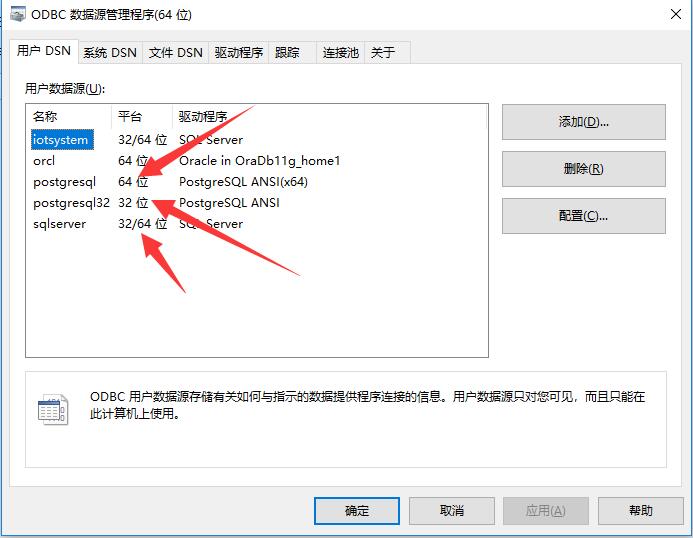 本系统除了支持直连各种数据库比如mysql、postgresql、sqlserver、oracle数据库,也支持odbc数据源的形式连接以上各种数据库,在配置数据源的时候,记得区分32、64位,对应数据源后面带有32/64一起字样的说明该数据源可以同时支持32位和64位的程序访问,不带的要用对应位数的才能访问。数据库名称记得填写的是数据源对应的名称,而不是数据源连接的数据库名称,很多人会搞错。