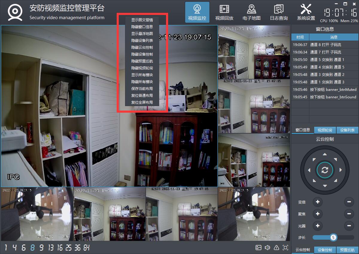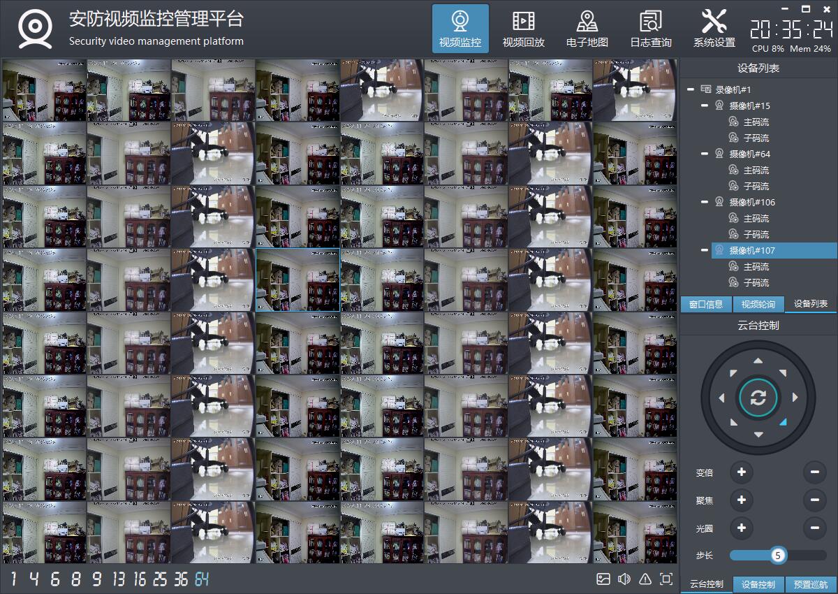 主界面由顶部主菜单导航、左侧右侧停靠窗体(设备列表、窗口信息、图文警情、悬浮地图、云台控制、设备控制、预置巡航、视频轮询等)、中间视频监控主画面组成,其中左右两侧的停靠窗体可以拉伸宽度,上下停靠窗体之间也可以拉伸高度,每个停靠窗体都可以关闭和悬浮。自动保存布局文件,下次启动自动应用。
