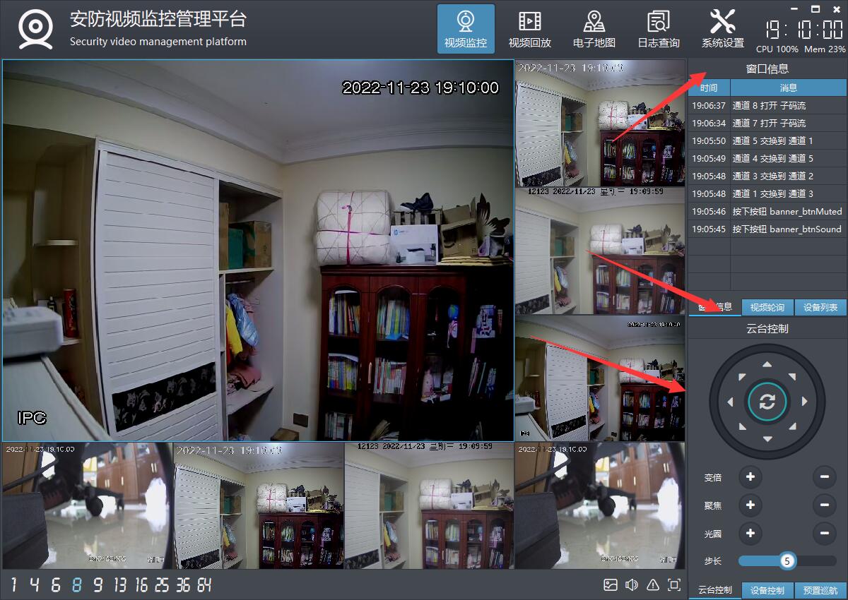 如果需要控制云台移动,先要选择对应的通道,边缘会高亮,进行云台控制的前提是该摄像机要是支持云台的摄像机,很多人以为啥摄像机都可以移动,这是错误的,如果摄像机不支持云台,这个功能就别玩了,玩不起,经常遇到一些人说怎么云台不能用了,一检查尼玛原来摄像机根本没有云台。