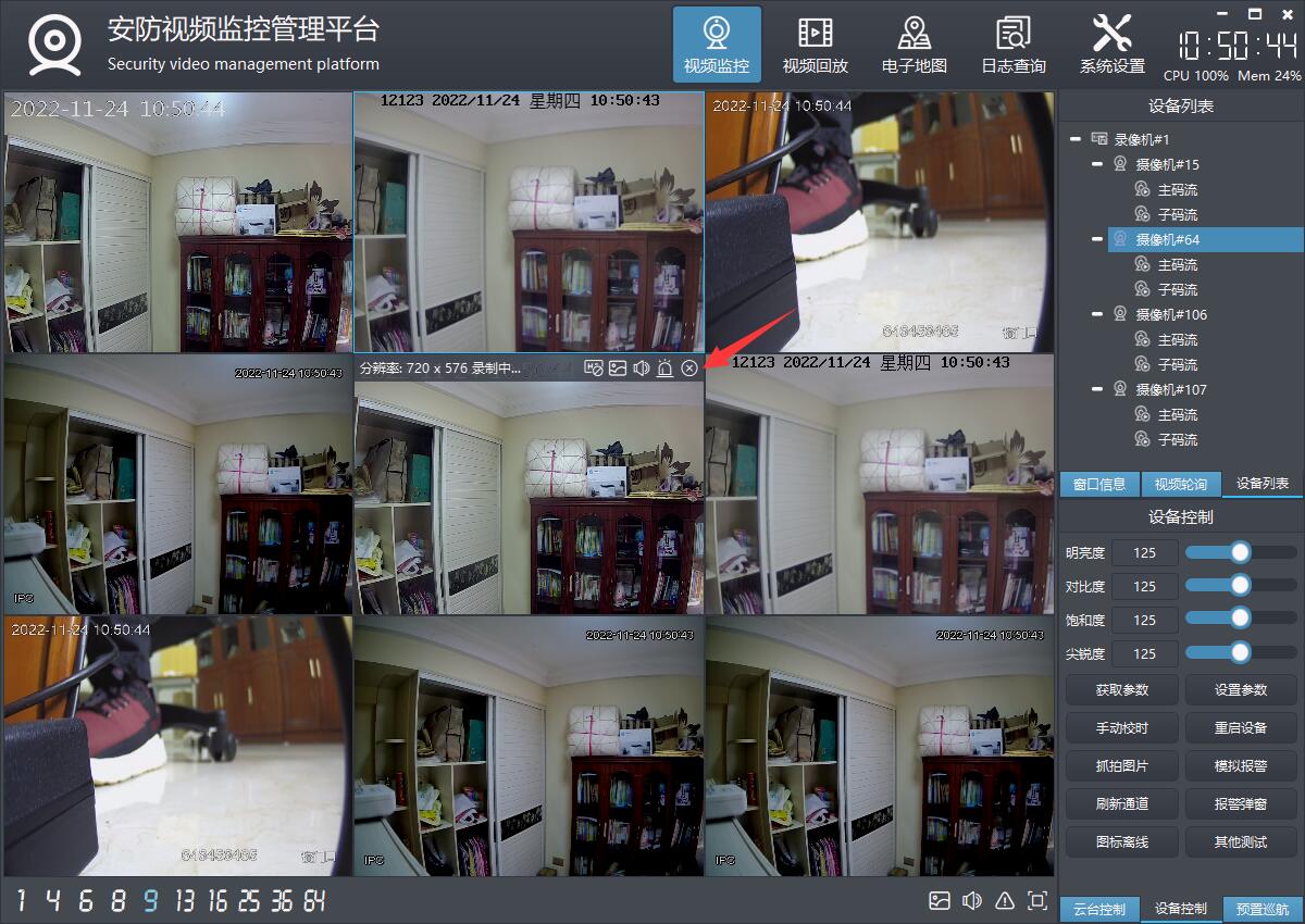 设备控制部分,目前可以获取和设置图片参数、手动校时、重启设备等,上面那一堆复选框对应功能需要用厂家sdk去实现,后期可能会增加一些onvif能够处理的功能。和云台控制操作一样,操作前也是需要选中某个通道,然后才是对选中的通道进行设备控制,比如图片参数中的明亮度、对比度、饱和度。