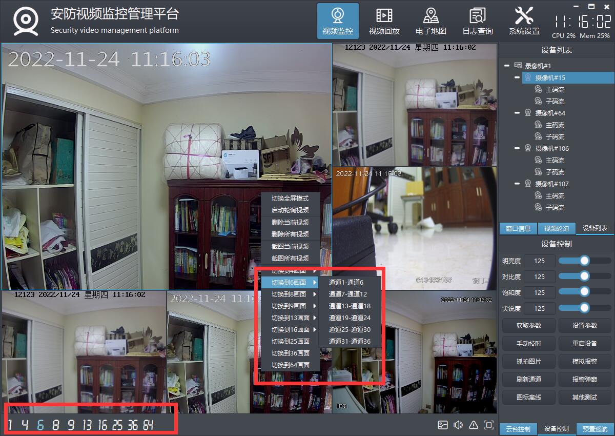 系统支持多画面切换,全屏切换等,包括1+4+6+8+9+13+16+25+36+64画面切换,如果还需要增加更多的画面比如81+100等,可以直接在源码中稍微修改即可。