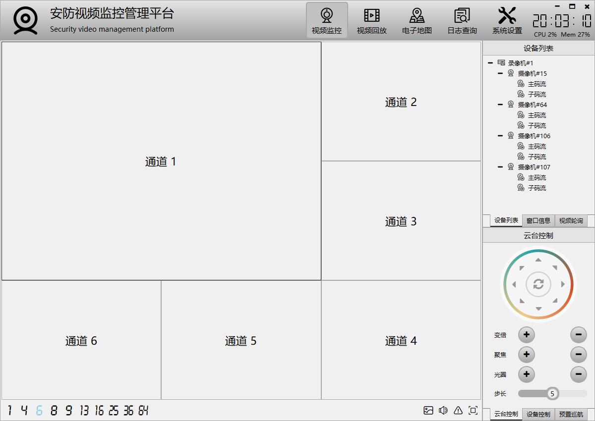 主界面由顶部主菜单导航、左侧右侧停靠窗体(设备列表、窗口信息、图文警情、悬浮地图、云台控制、设备控制、预置巡航、视频轮询等)、中间视频监控主画面组成,其中左右两侧的停靠窗体可以拉伸宽度,上下停靠窗体之间也可以拉伸高度,每个停靠窗体都可以关闭和悬浮。自动保存布局文件,下次启动自动应用。