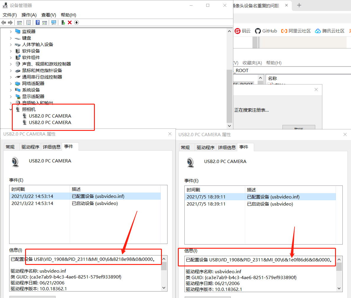 在需要加载多个USB摄像机的场景下,有时候会遇到同名的USB名称设备,此时需要打开注册表进行设备名称修改后,按照新修改后的设备名称填入即可。