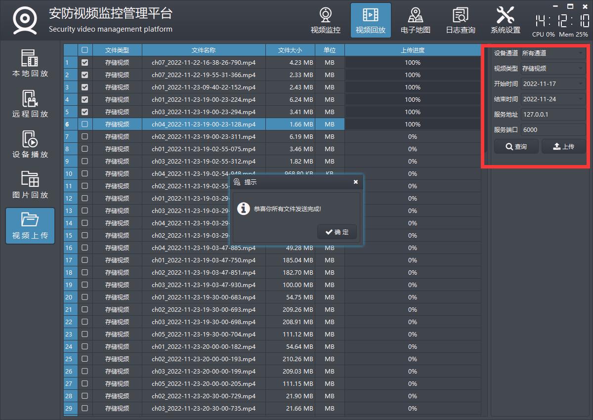 视频上传功能主要用来将本地存储的视频文件(也可以是其他文件),通过网络传输(默认TCP)上传到其他地方比如服务器,服务器上要运行接收文件的程序,这样就相当于远程备份视频文件的功能,视频文件可以勾选需要上传哪一些。