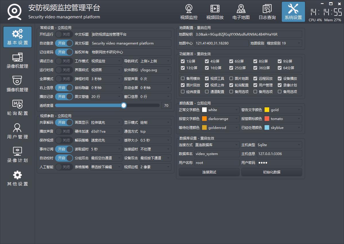 | frmconfigsystem | 系统设置,包括基本设置、视频参数、数据库设置、地图配置、功能激活、颜色配置、串口配置、网络配置等。 |