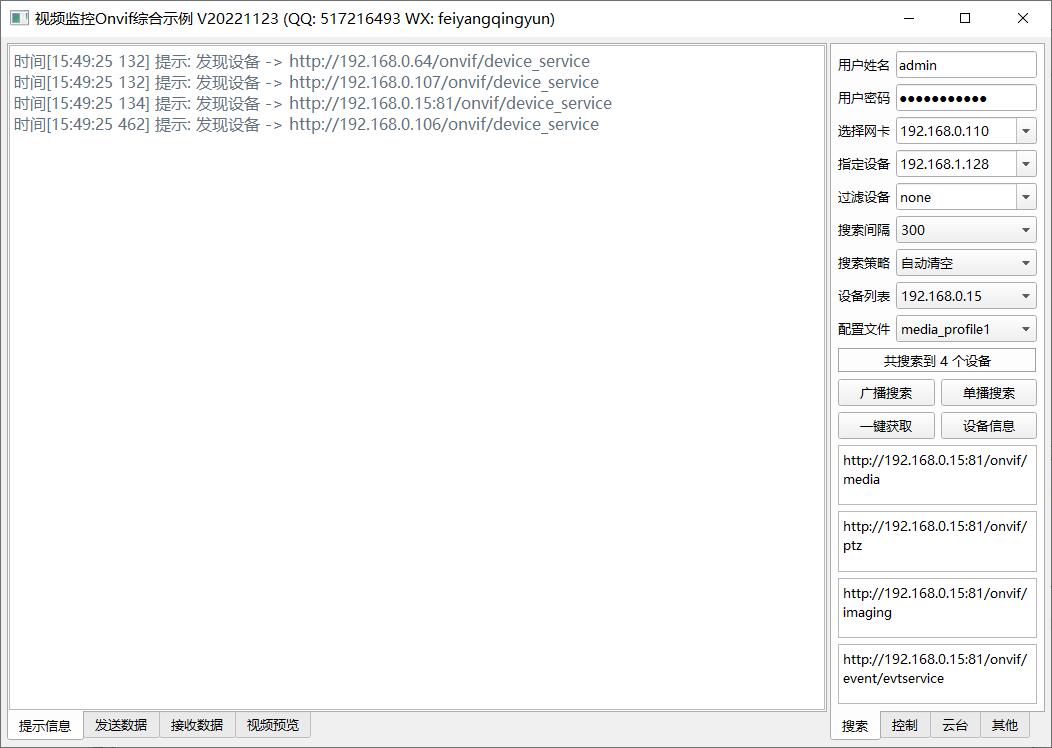 本系统云台控制走的是onvif协议,没有使用私有协议,上百家厂家的摄像机,走私有协议会玩死人的,所以统一采用onvif通用协议,需要提前在系统设置中的摄像机管理,搜索摄像机,输入正确的onvif用户信息后一键获取到云台地址。