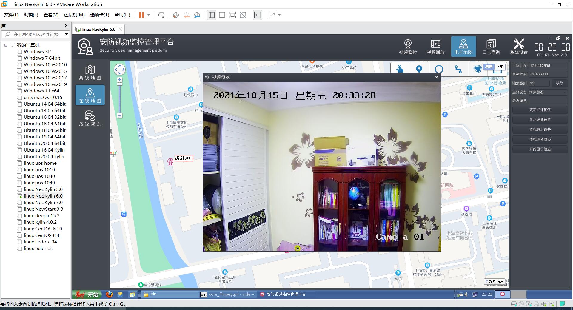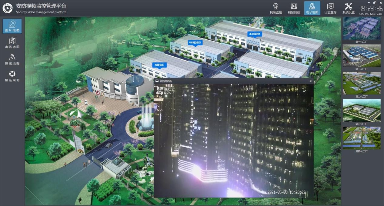 电子地图有多个子模块,分别不同的功能,在每个模块上,双击对应的摄像机,都可以弹出实时视频预览画面,支持多个画面同时打开,每个摄像机都一个画面窗体。