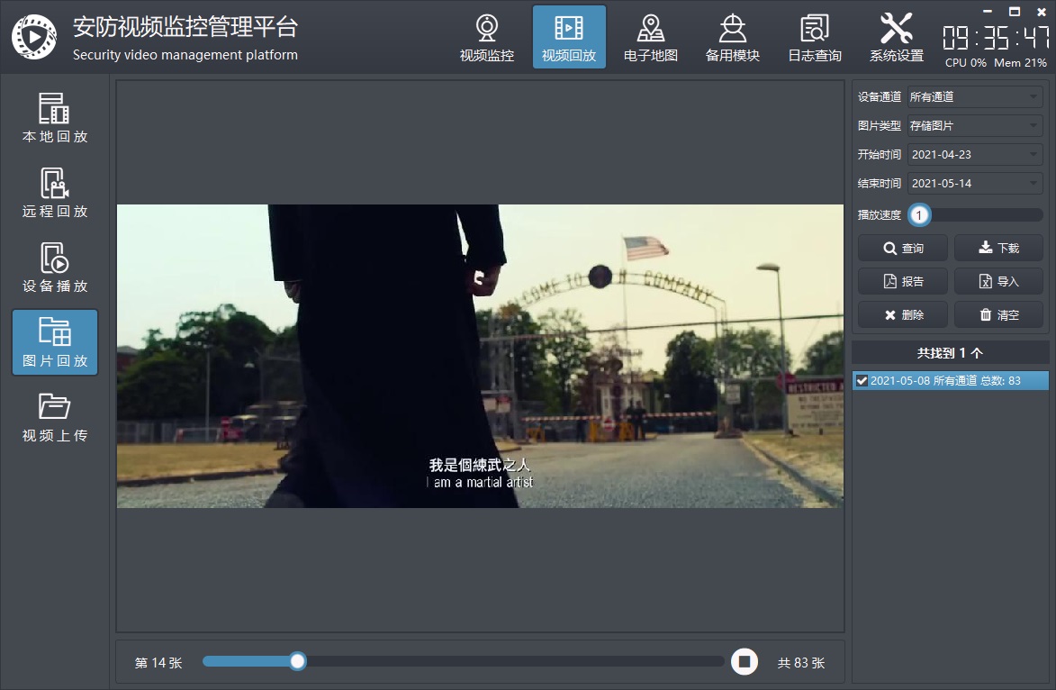 选择设备通道和时间范围,单击查询按钮,会将查询到的图片序列按照日期的形式作为一行添加到列表结果中,双击可以自动播放,可以调节播放速度。