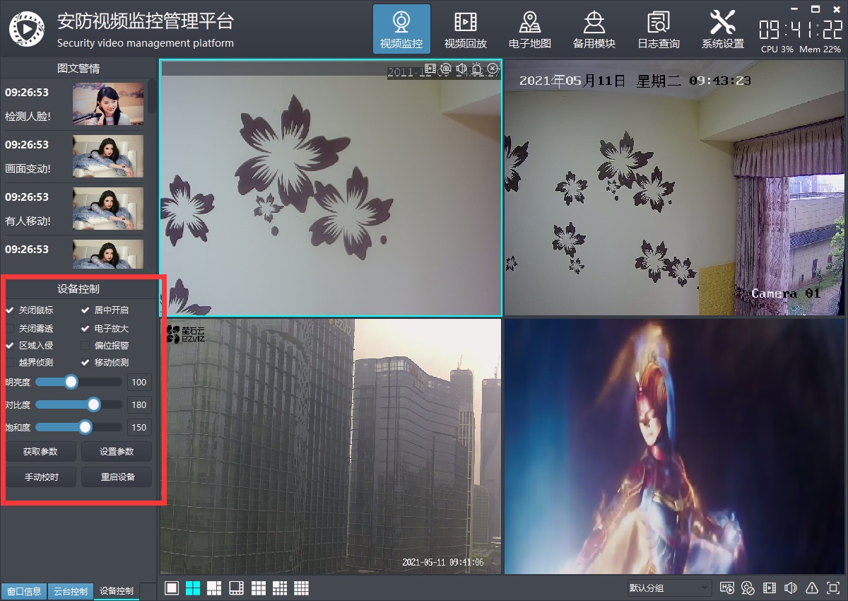 电子地图有多个子模块,分别不同的功能,在每个模块上,双击对应的摄像机,都可以弹出实时视频预览画面,支持多个画面同时打开,每个摄像机都一个画面窗体。
