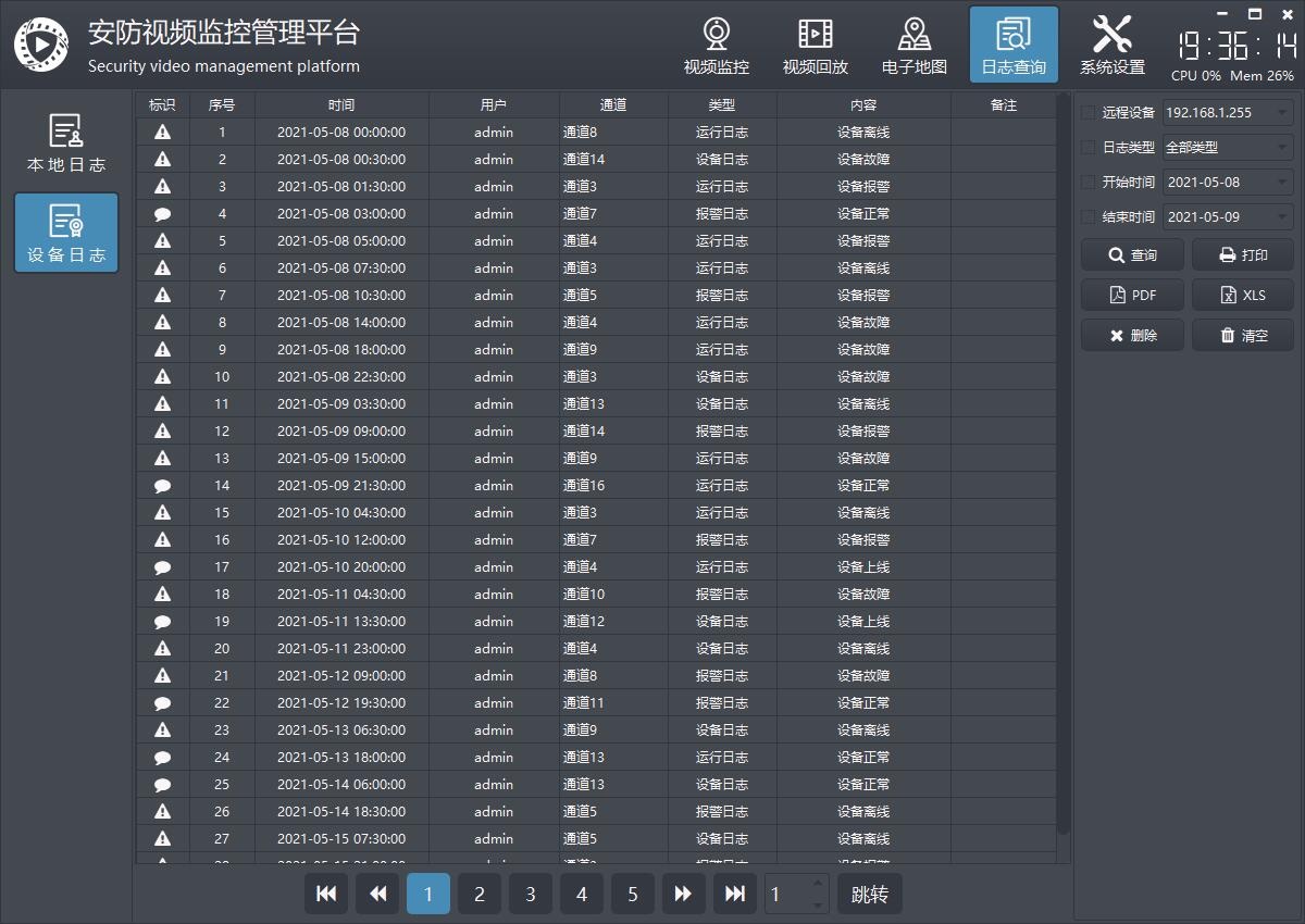本地日志存放的是本系统的操作日志,比如用户登录退出、记录删除、设备报警等操作,都会有对应的记录存放的数据库,可以在这里选择时间段和日志类型进行查询。查询后的日志记录可以翻页查看,还可以直接支持指定页码跳转,(此翻页组件超级牛逼,外观和功能分离,自动计算页码切换导航,具体可参见对应类的头文件功能描述),每页显示多少条记录在系统设置中可以设置。